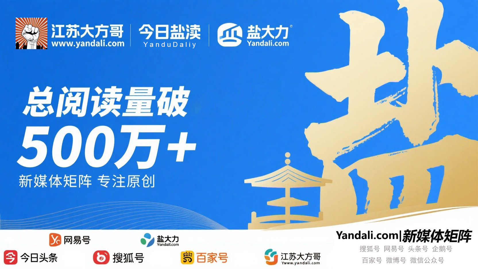 门户网站(www.yandali.com)及今日头条、搜狐号、百家号、网易号等多平台账号,总阅读量突破500万+,以深耕本土、坚持原创为核心竞争力,成为连接盐城民生、文化、商业资讯的重要新媒体窗口。